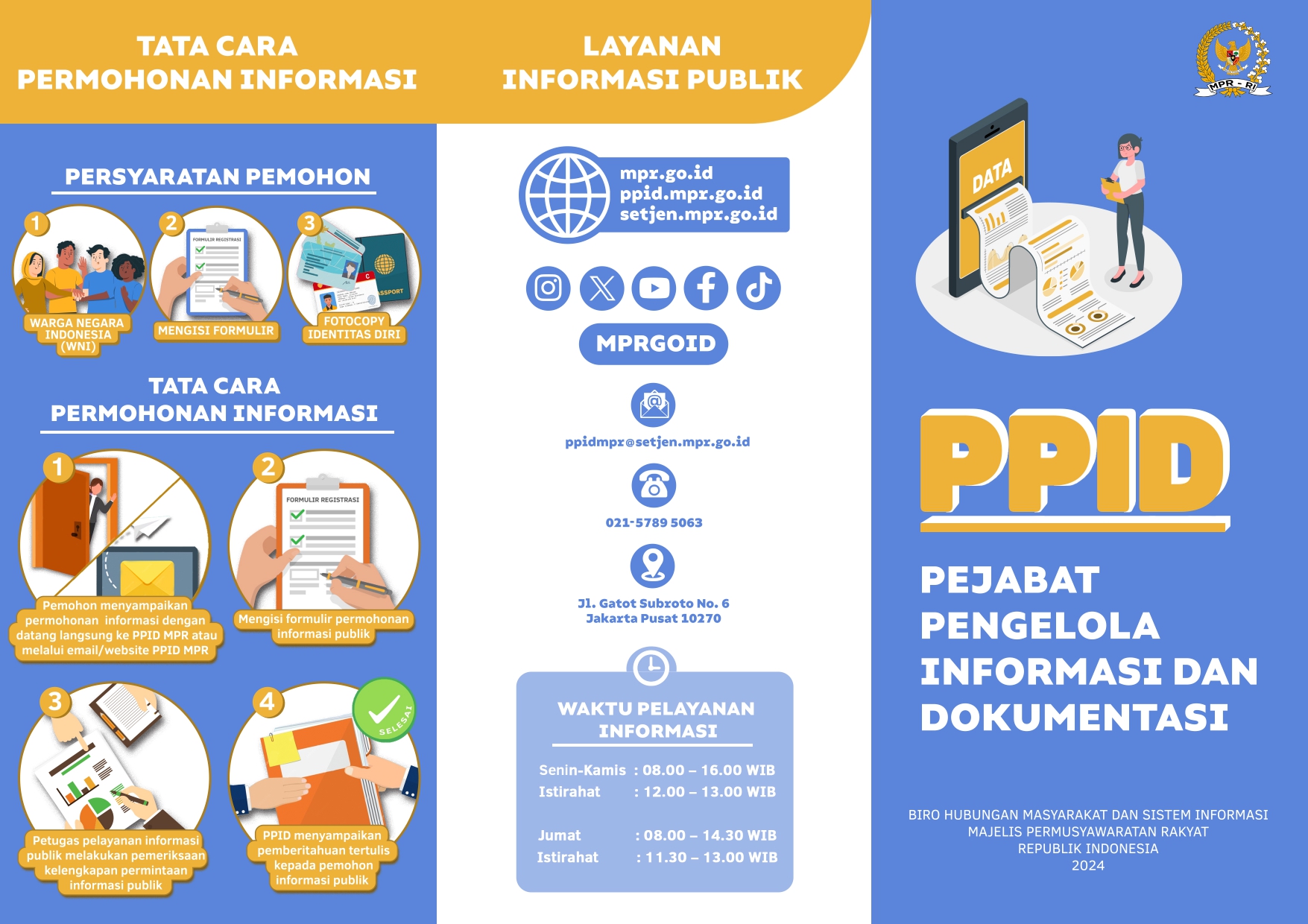 - Pemohon informasi menyampaikan permohonan informasi kepada PPID, melalui website resmi PPID, surat elektronik, surat tertulis atau datang langsung ke ruang pusat layanan informasi publik MPR RI.